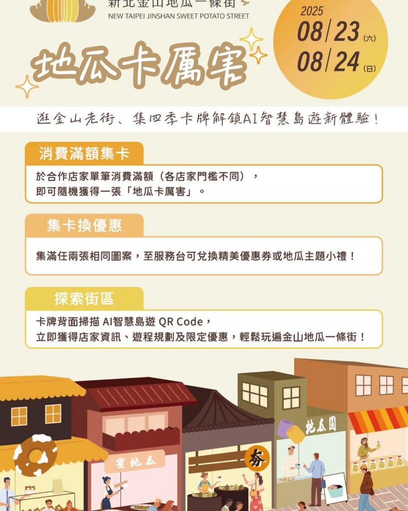 新北金山地瓜一條街限定 來逛街,還能集卡抽好康!【地瓜卡厲害】熱鬧開抽 活動時間:8/23(六)- 8/24(日) 地點:新北金山地瓜一條街 玩法超簡單 ① 單筆消費滿額 → 拿到隨機「地瓜卡」一張 ② 集滿兩張相同圖案 → 兌換精美優惠券或主題小禮物! ③ 卡牌背面掃描 QR Code → 解鎖 AI 智慧島遊,查詢店家、優惠、路線資訊 走進金山老街,吃地瓜、集卡牌、抽好禮~ 讓你邊逛邊玩,滿手好運帶回家! 名額有限,記得先報名導覽活動唷!(放報名連結) #地瓜卡厲害 #金山老街 #地瓜一條街 #集卡遊戲 #AI智慧島遊 海洋,是我們共同的家園